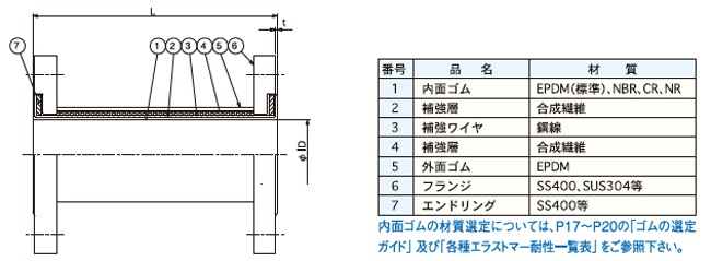●各変位は許容変位量の範囲でご使用下さい。 ●取付時寸法許容値は許容変位量に含まれますので複合変位の場合は補正を要します。 補正方法についてはP21をご参照下さい。 ●埋ゴムタイプの場合は上記サイズ表の許容変位量及び取付時寸法許容値に圧縮・偏芯・角変位の場合は0.5、伸長の場合は0.6をかけて算出して下さい。 ●表中のφG寸法は、JIS10Kフランジ使用の場合の標準寸法となります。 |